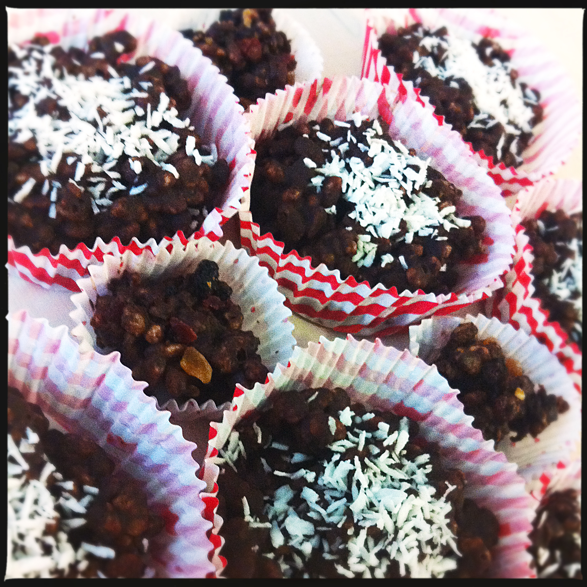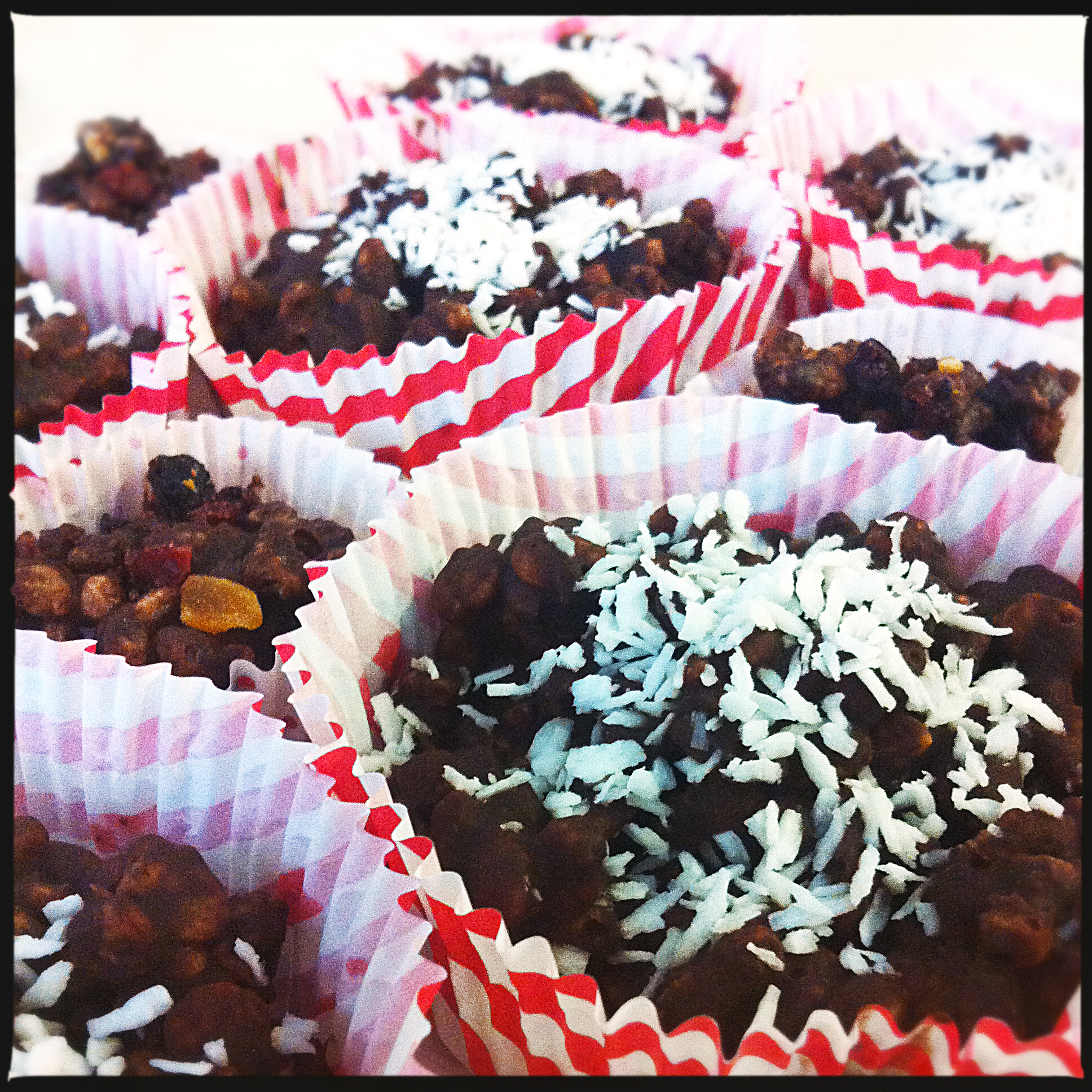 What seems like ages ago, I posted about chocolate crackles and how, at my little L’s nursery school celebrations for UN day they were so popular I didn’t even have time to take a photo of them before they all disappeared into the mouths of pre-schoolers (and their parents!). So I guess this post is a bit of a repeat performance. To make things easy, I will post the recipe again here. The only modifications I made to my latest “Christmassy” batches were to sprinkle the tops of half the batch with extra coconut (or “snow” 😉 ) and to mix in chopped dried cranberries, cherries and apricots (delicious!) to the other half of the batch before spooning into cute little truffle-sized paper cases. We took these as our afternoon tea contribution for the baby Christmas party we attended a couple of weeks ago. I have also served them for my girlfriends at two of our recent crafting get-togethers (including today’s one). So easy. And so easy to “dress up” with the addition of an extra ingredient. I can’t wait to perfect a white chocolate version too!