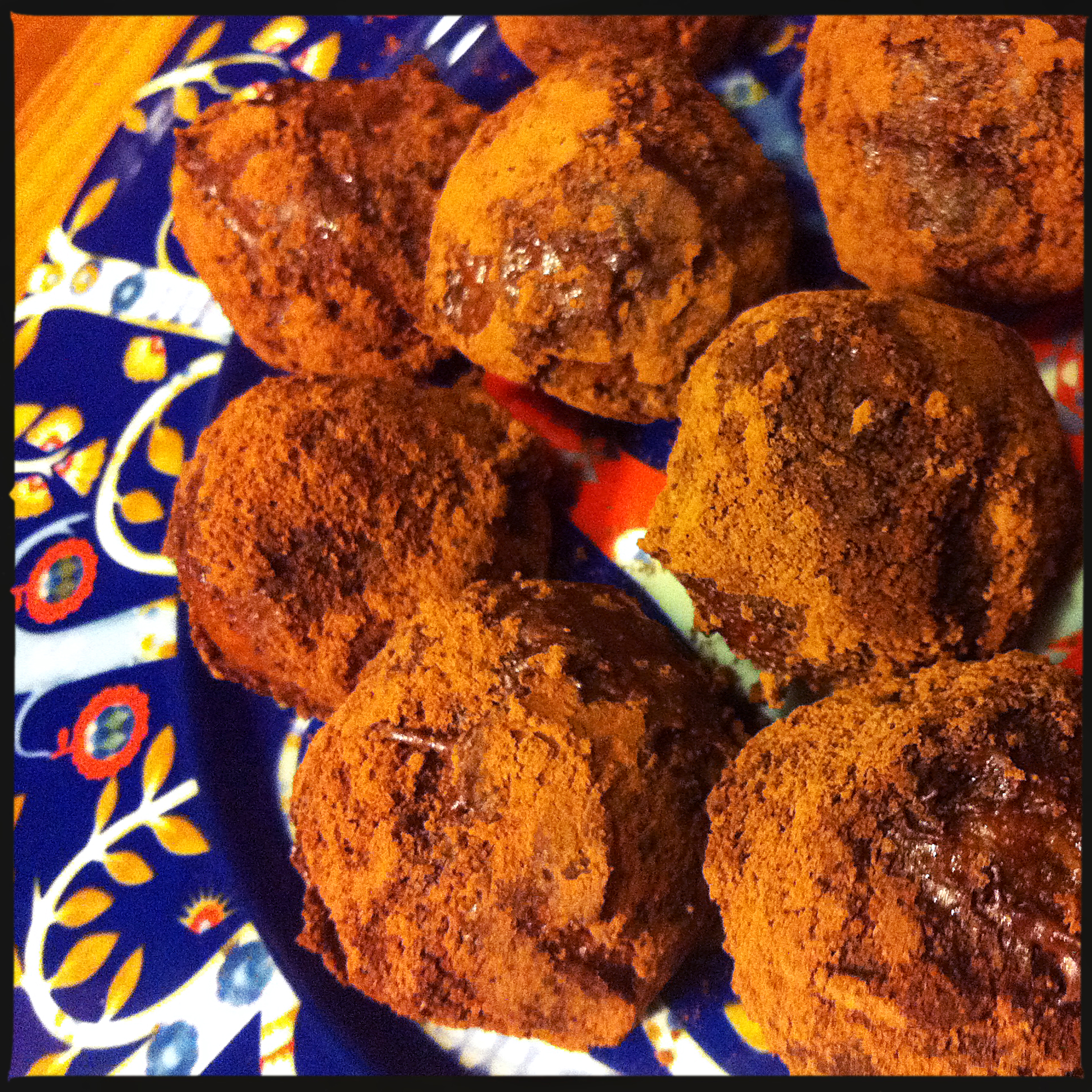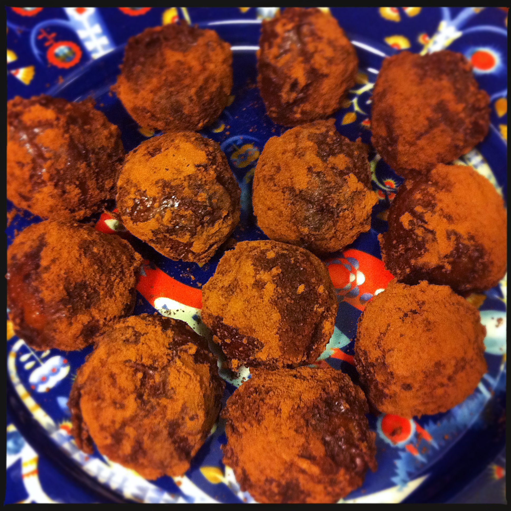 - Melt chocolate. Dip all the truffle balls in chocolate, then sprinkle liberally with cocoa mix. Let chill in fridge and take out a little while before needed.
