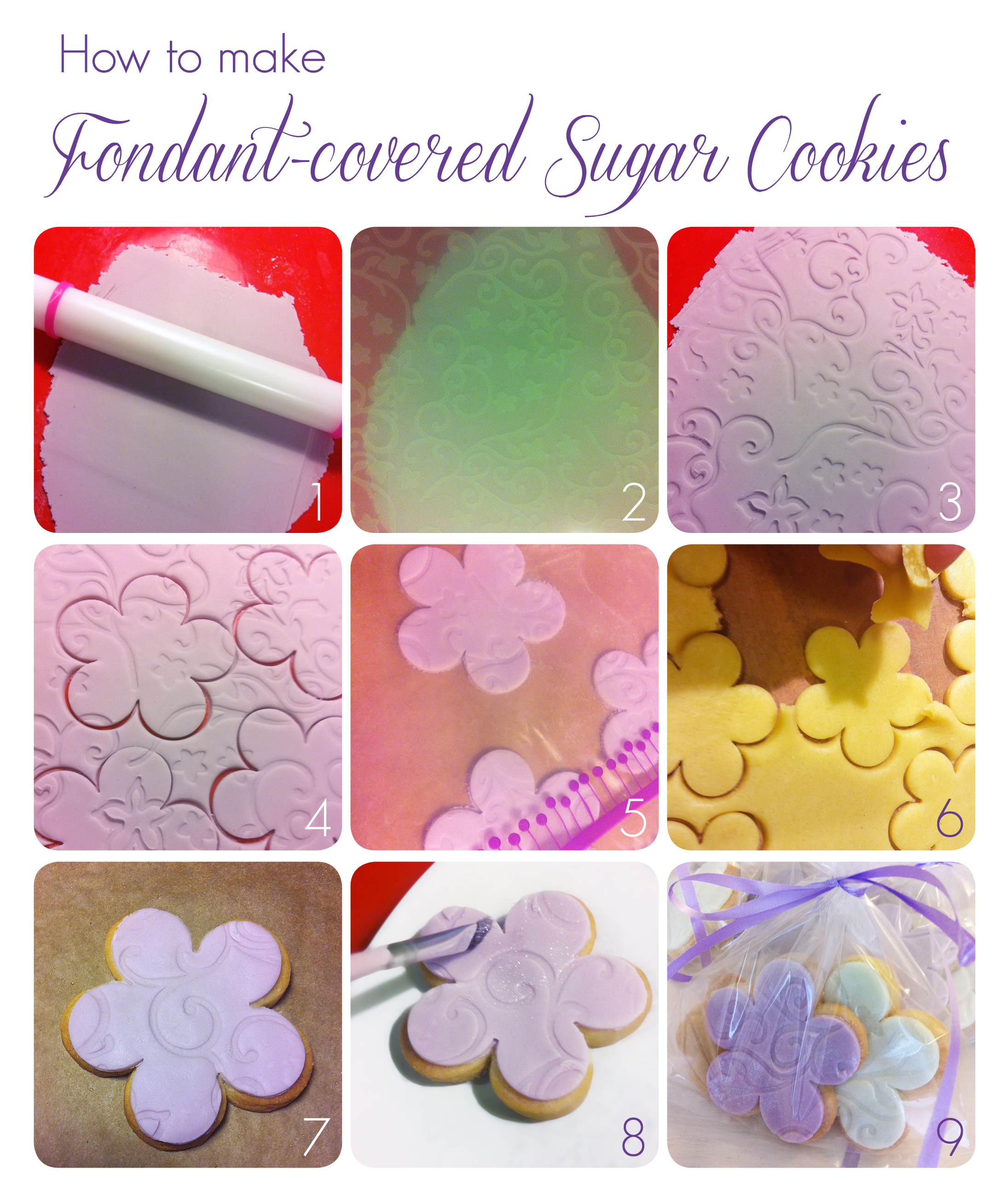 For those who are interesting in decorating sugar cookies with rolled fondant, these are the steps I took:
