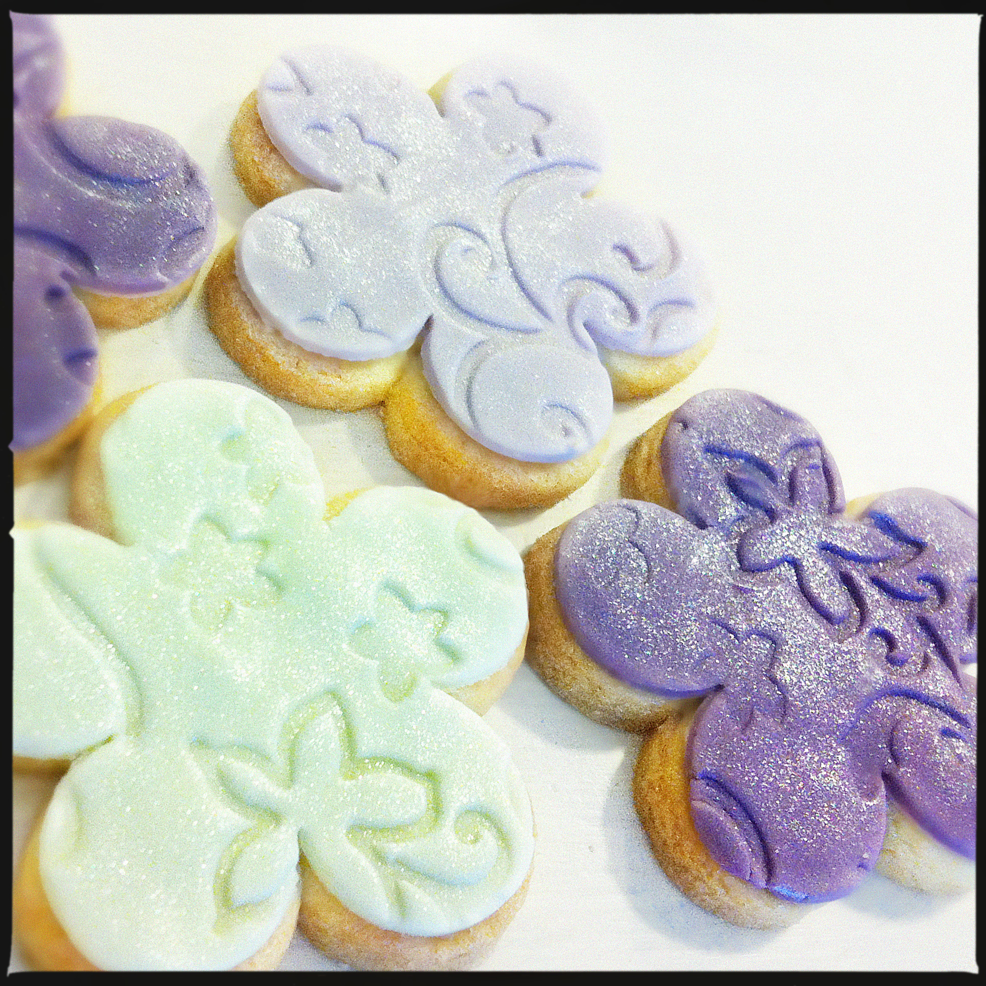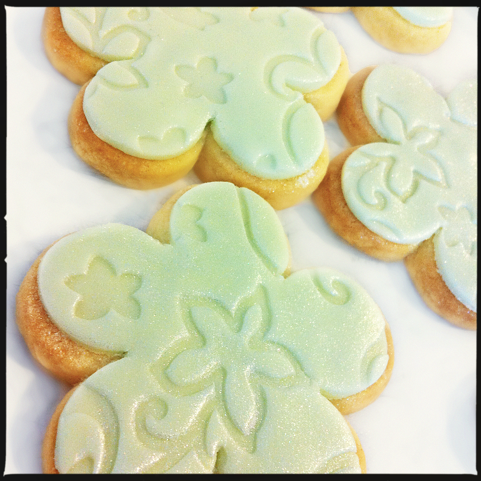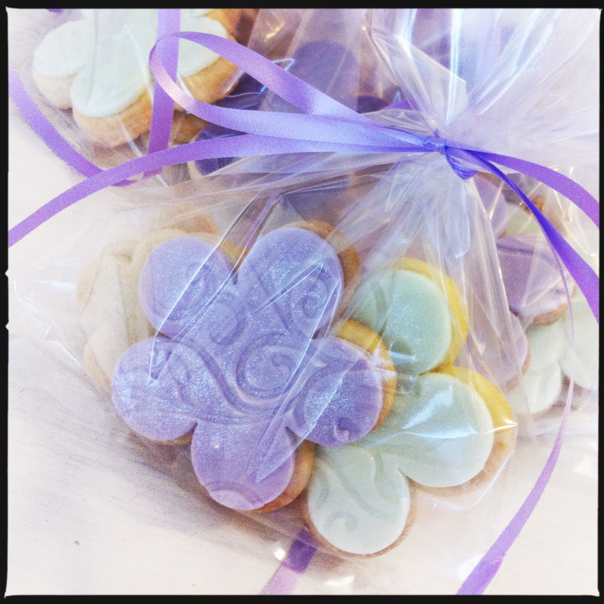 There were 3 things that I offered my blessingway guests as thank you gifts; a scented candle, a choice of accessories (bags, scarves, etc.) and these cookies! I have wanted an excuse to make fondant-covered cookies for some time and this occasion was the perfect one. I am so incredibly happy with this sugar cookie recipe (modified from one found at Karen’s Cookies), that I don’t think I’ll ever use another! These cookies worked perfectly, holding their shape and making them perfect for decorating with fondant. Moreover, they are absolutely delicious! I used the same fondant as for my cupcake decorations, so everything was perfectly colour-coordinated. I have received lots of lovely compliments about them post-party and will definitely be making these cookies again!