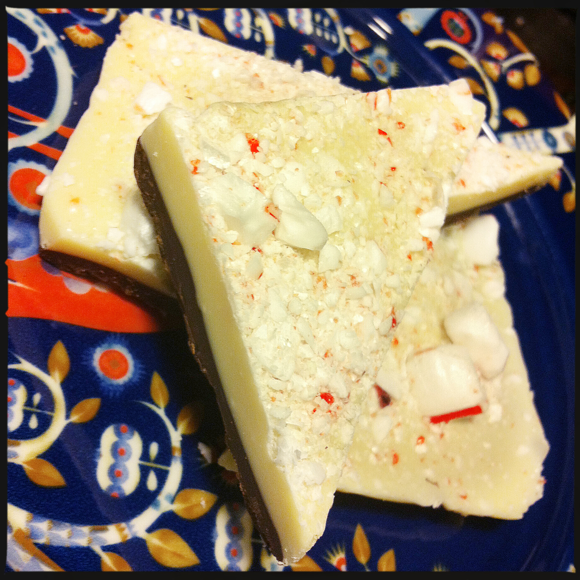 - Meanwhile, melt the white chocolate. Spread the white chocolate mixture evenly over the dark/milk chocolate. Sprinkle crushed candy pieces evenly over the white chocolate layer. Chill until set (at least 1 hour). Cut into triangular shards to serve.
