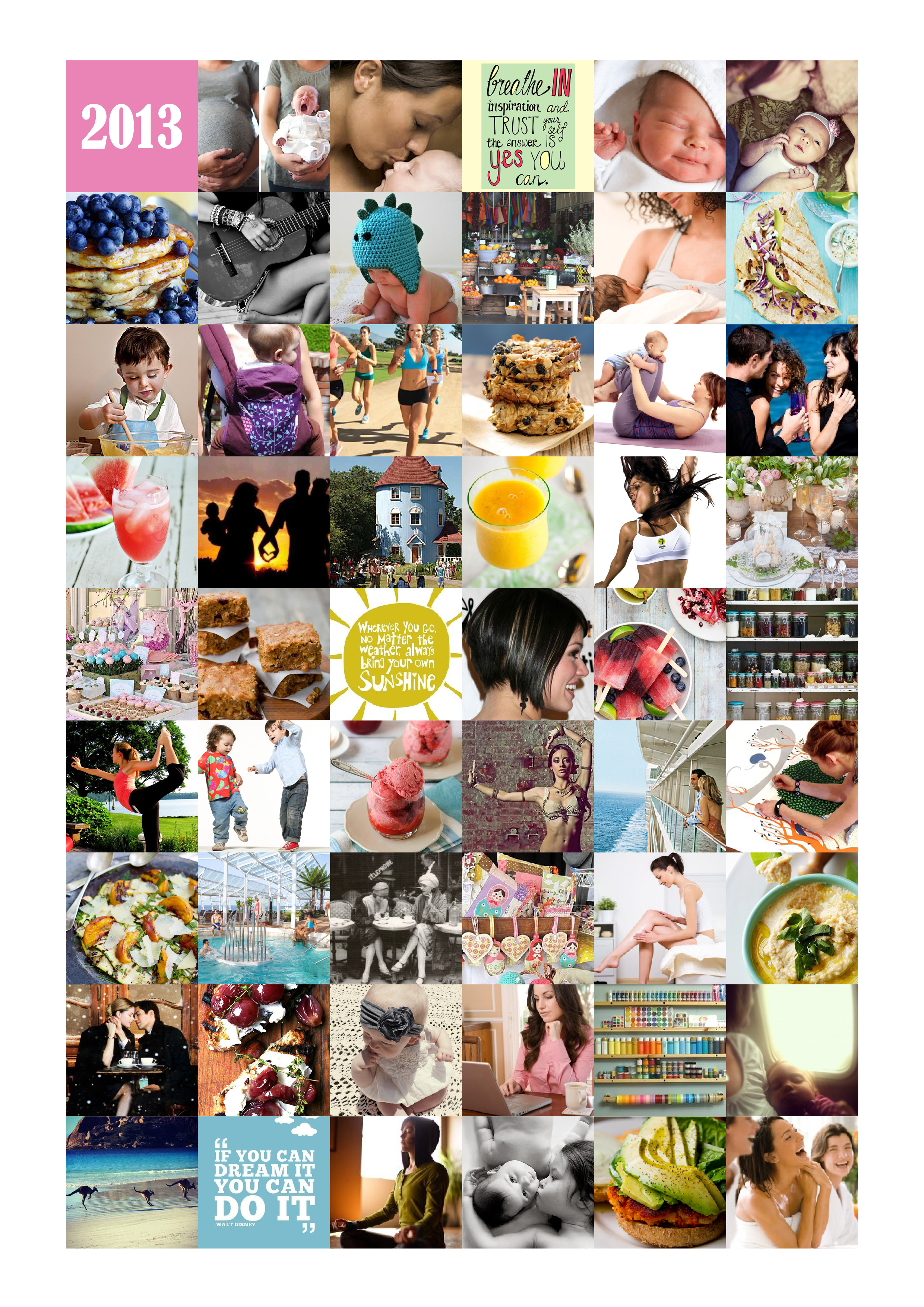 I needn’t state the obvious by saying that 2013 is right around the corner, but as it is, I thought I’d share a pre-New Year’s Eve activity idea. For those of you who believe (as I do) in the power of positive thinking and your thoughts creating your reality, a visualisation mood board may appeal to you. I have created many over the years and I am always astounded that they work so well! Among the dozens I have created, I recall particularly one I made just before I landed my “dream job”, another created just prior to my first successful pregnancy and another I stuck to the back of my bedroom door to keep me positive/help me heal whilst on bed rest after I received my high risk pregnancy diagnosis this year. Based on the incredibly positive results I have had from doing affirmations/meditation/visualisation exercises, I have every reason to believe that mood boards such as this help aid/affirm powerful intention, increase motivation and evoke feelings of positivity. You can easily create your own using a page layout program such as InDesign, make one using magazine images and ye olde cut-and-paste methodΒ or, if really pressed for time, why not create a Pinterest board called “2013” and cram it with pins of the things you’d like to fill your life with this coming year?