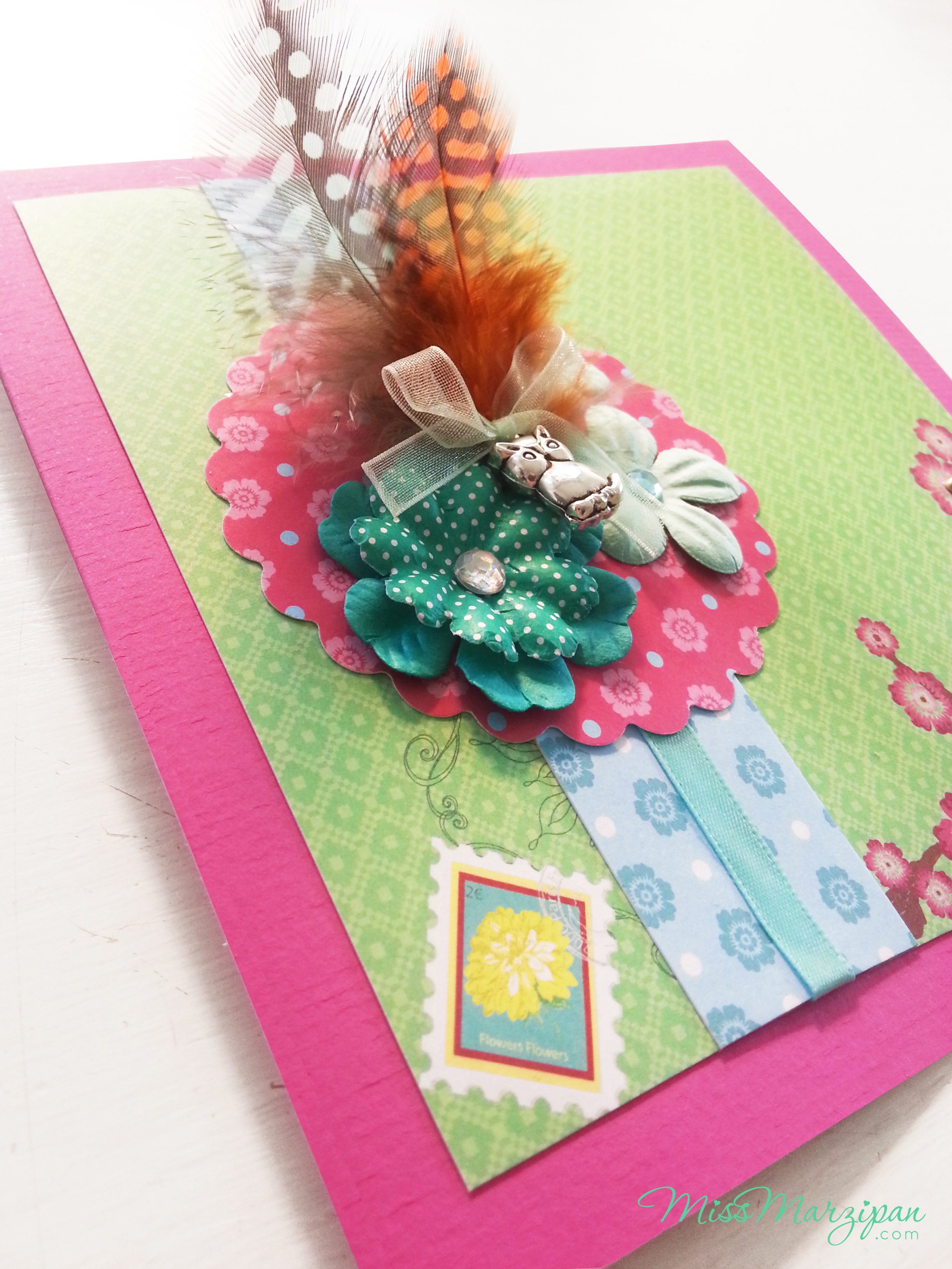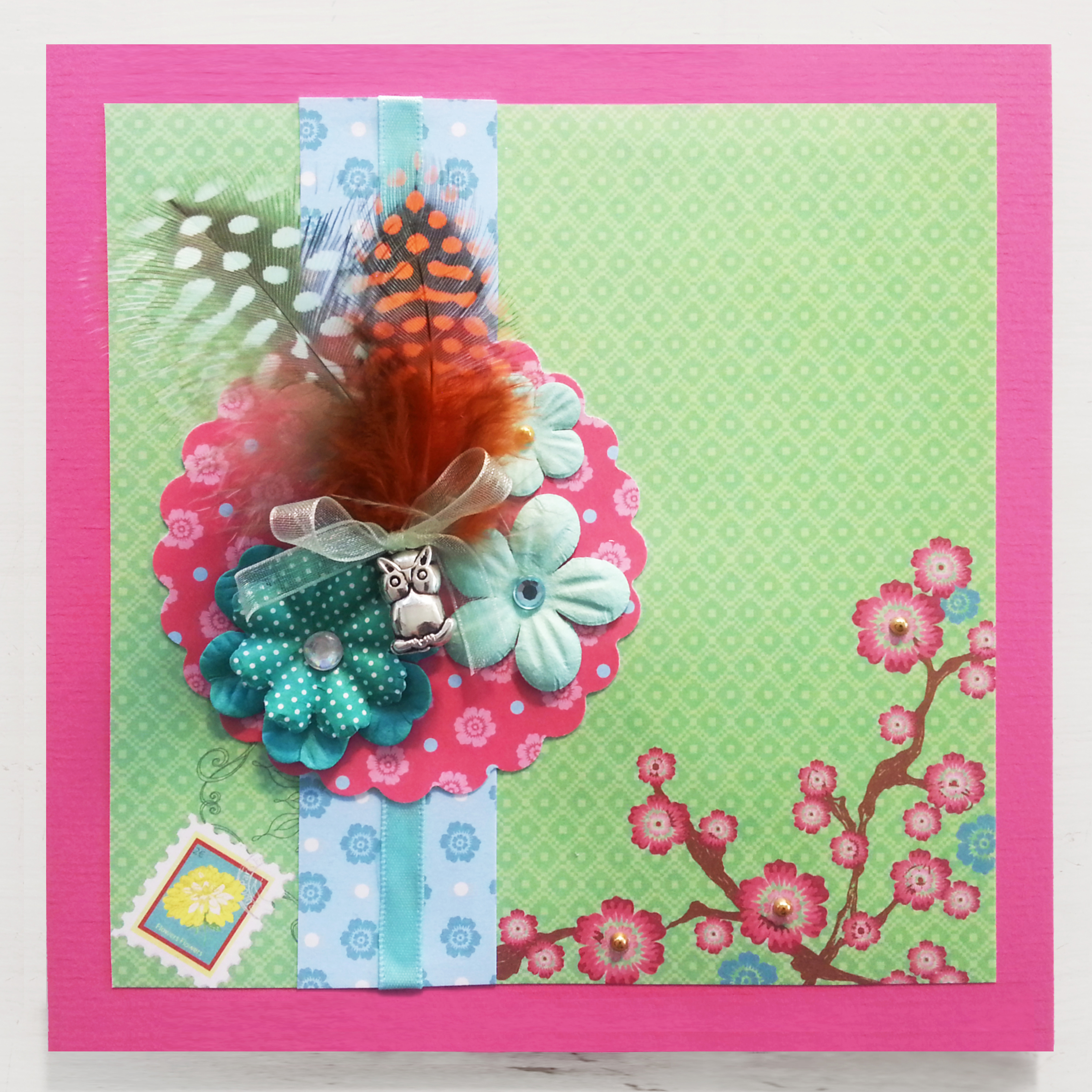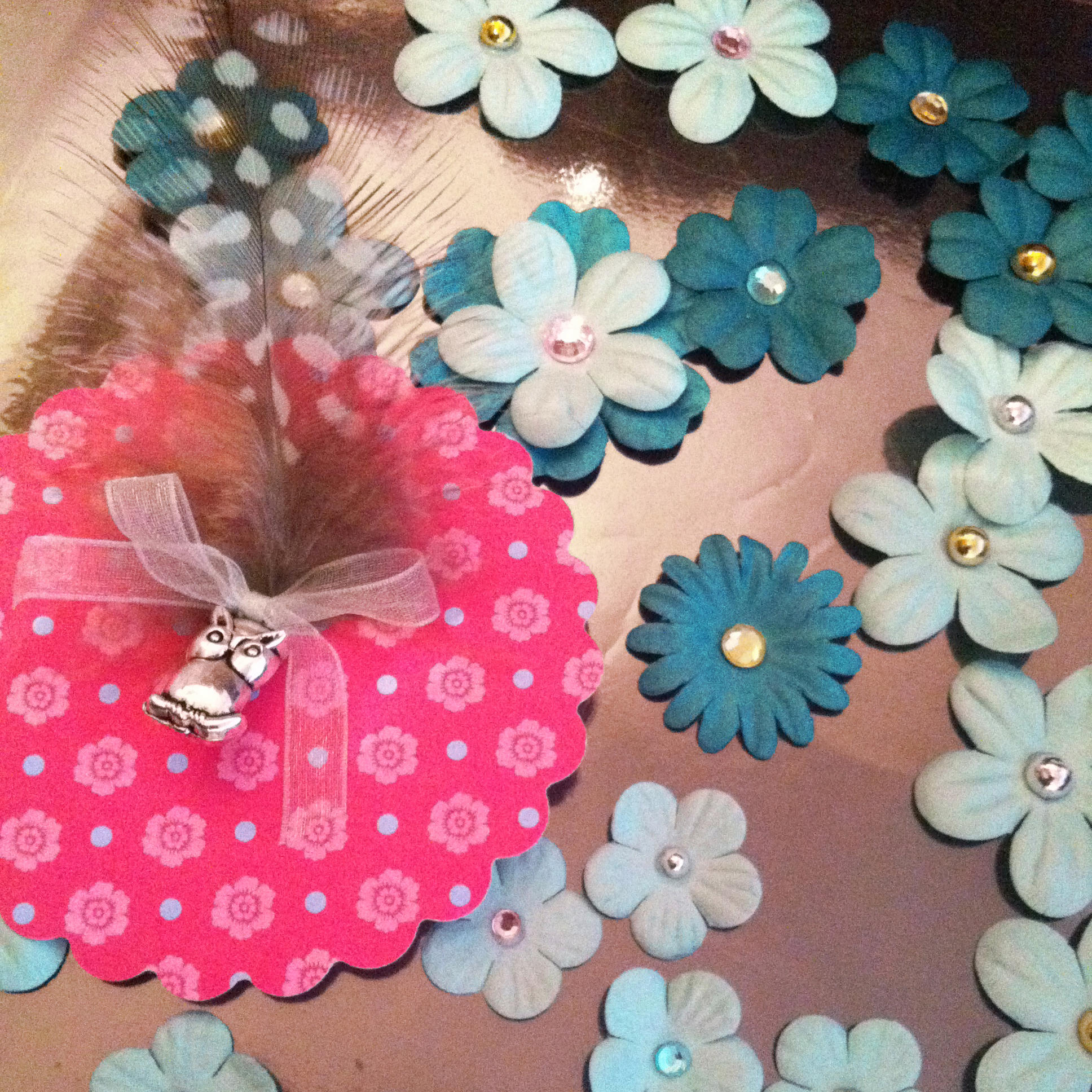 As someone who has had extremely limited experience making cards with scrapbooking supplies, I decided to just let my imagination and the colours/forms/patterns of the things I had purchased guide me through the process. I particularly loved selecting papers that created contrasting yet somehow harmonious combinations and fabricating embellishments using a variety of materials such as paper flowers, diamantes, lace, feathers and ribbon. Adding charms to all of this may be taking things a step too far for some, but not for me. I found that gorgeous little silver owls, teapot and tea-cup charms and gold bells (that I had leftover from Lindt chocolate Easter bunnies) were lovely accents to add. Matching up papers with completed embellishments was exciting. I approached the whole process much as I do cake decorating by having the embellishments/decorations ready to go first, but adding them last.