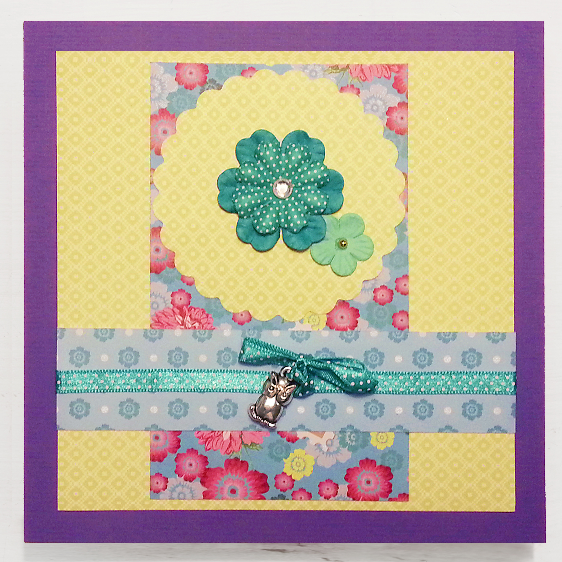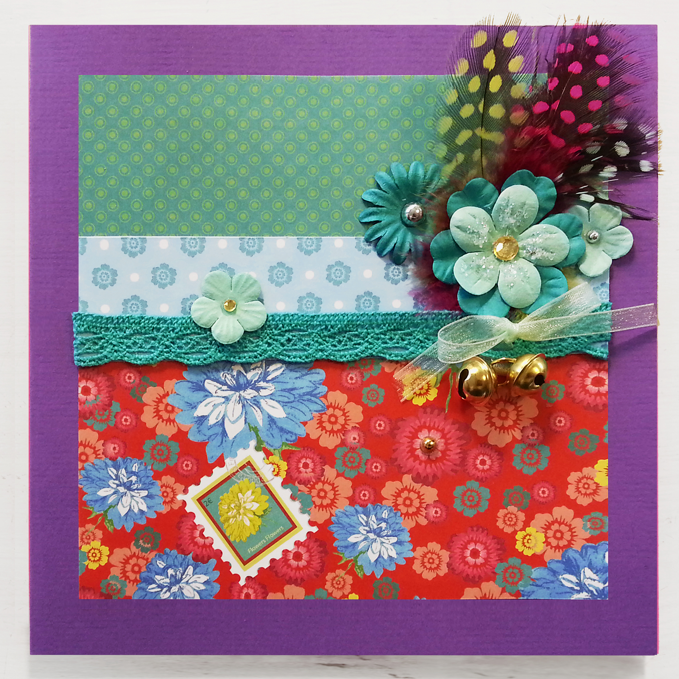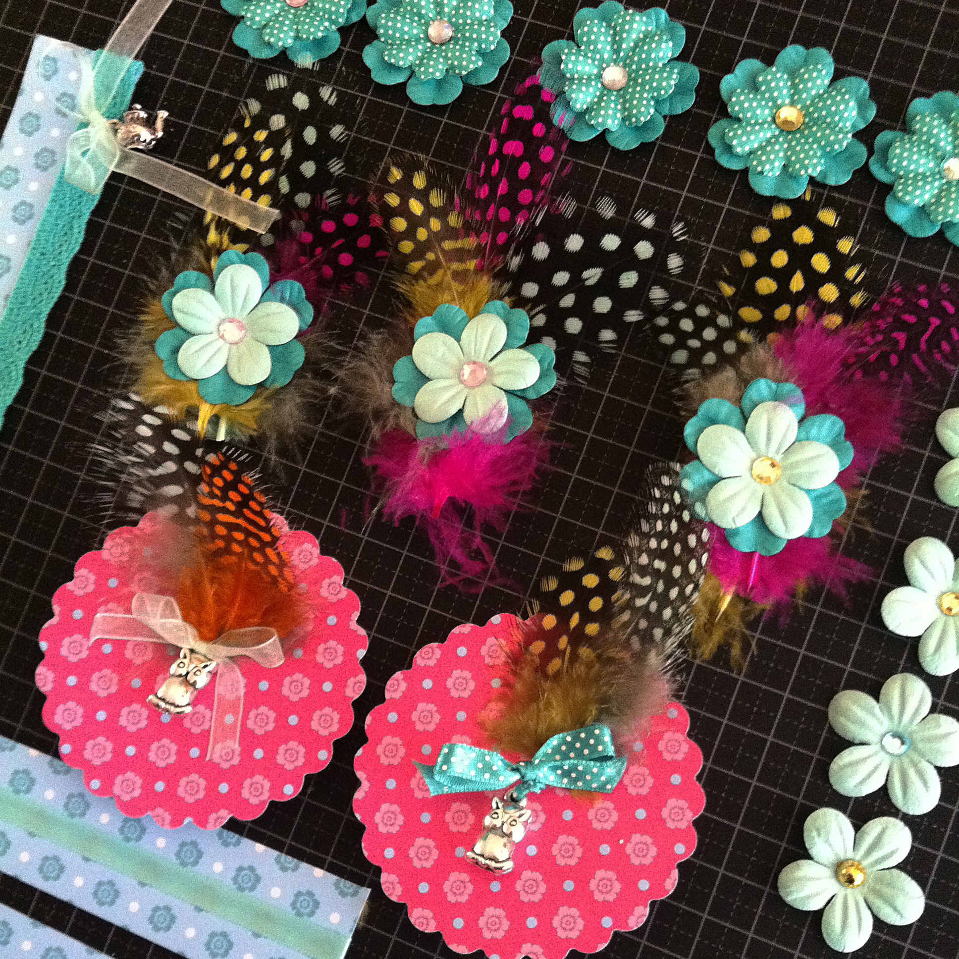 As someone who has had extremely limited experience making cards with scrapbooking supplies, I decided to just let my imagination and the colours/forms/patterns of the things I had purchased guide me through the process. I particularly loved selecting papers that created contrasting yet somehow harmonious combinations and fabricating embellishments using a variety of materials such as paper flowers, diamantes, lace, feathers and ribbon. Adding charms to all of this may be taking things a step too far for some, but not for me. I found that gorgeous little silver owls, teapot and tea-cup charms and gold bells (that I had leftover from Lindt chocolate Easter bunnies) were lovely accents to add. Matching up papers with completed embellishments was exciting. I approached the whole process much as I do cake decorating by having the embellishments/decorations ready to go first, but adding them last.