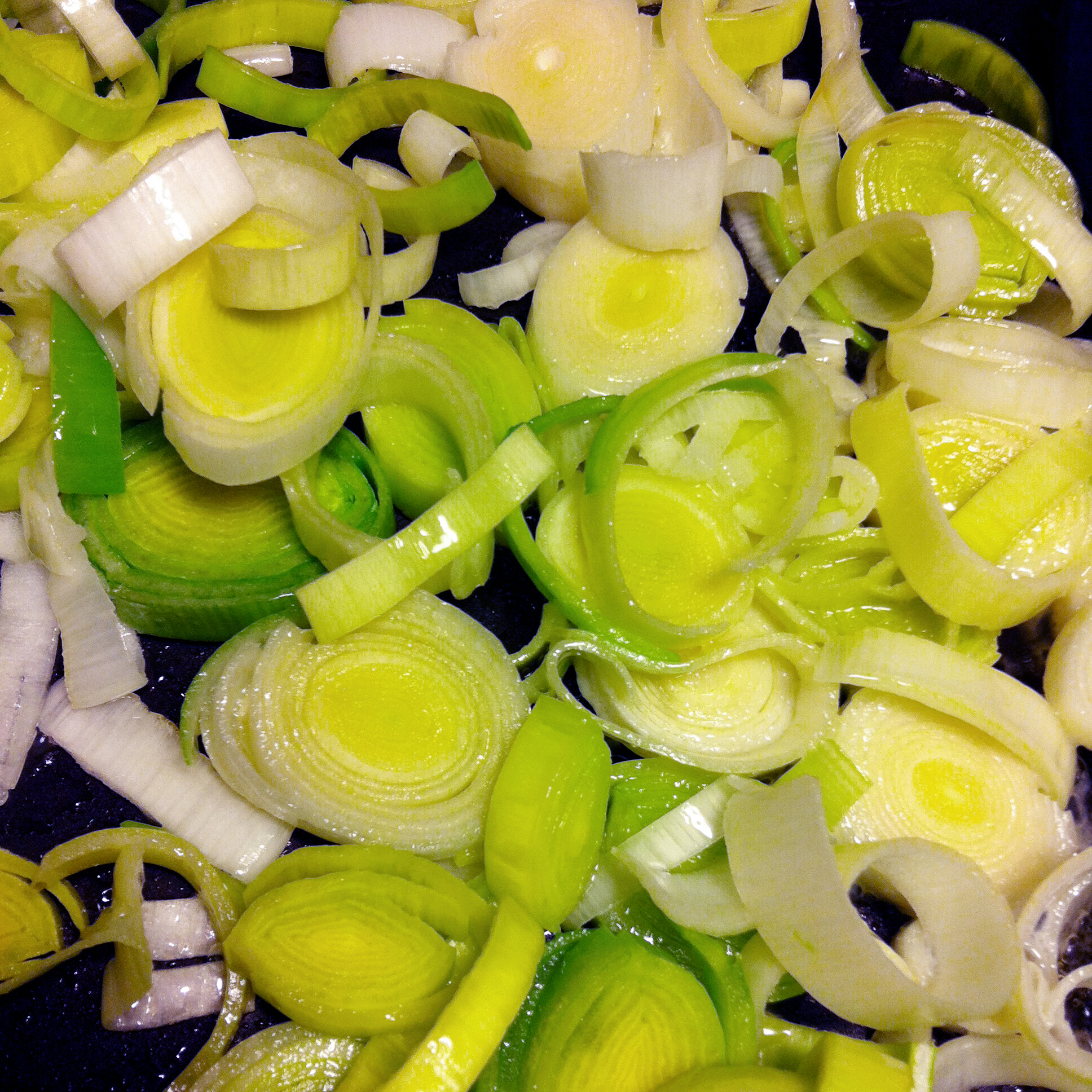 - Melt the butter in a large frying pan over a medium-low heat. Sweat the leeks with a good pinch of salt until soft and tender.