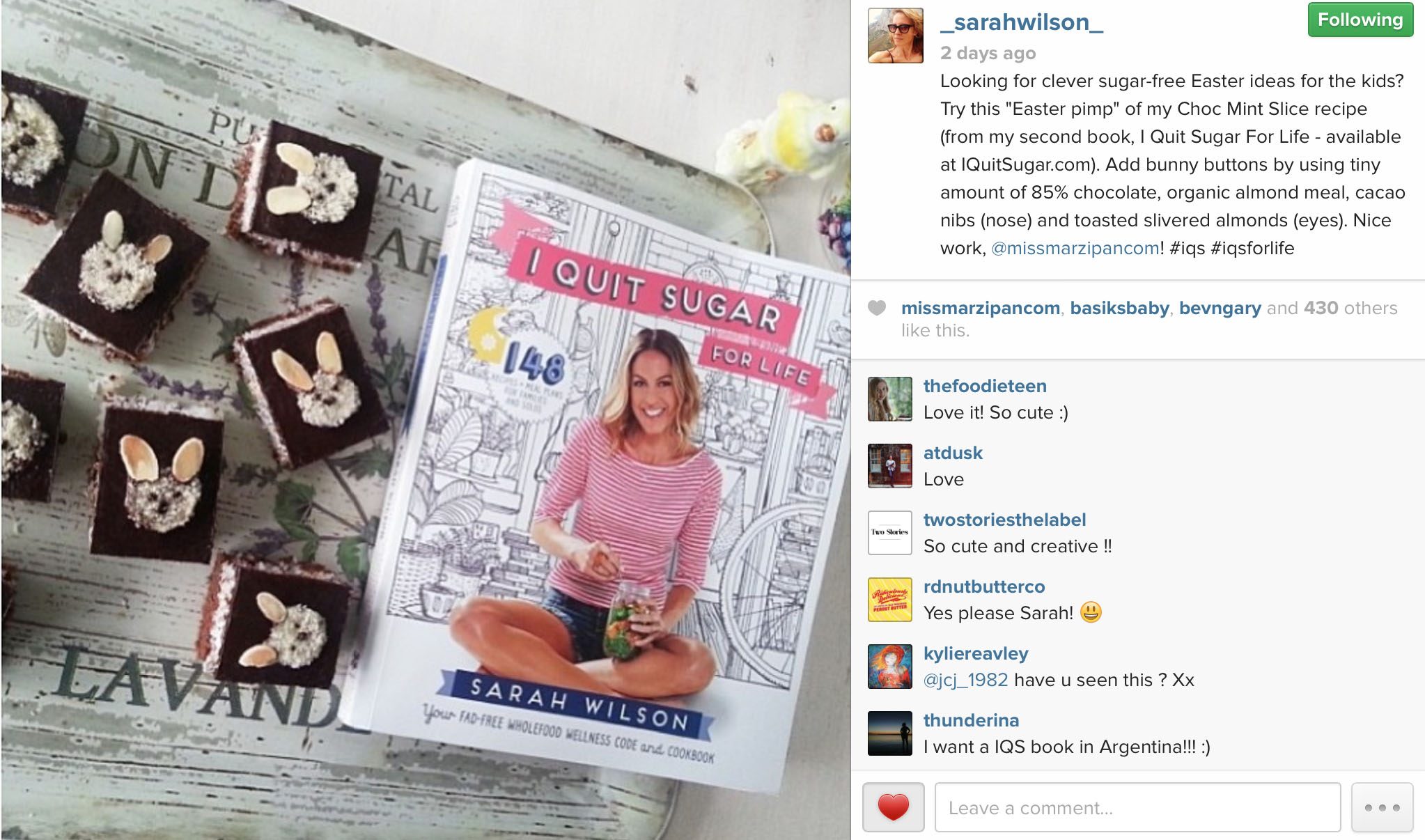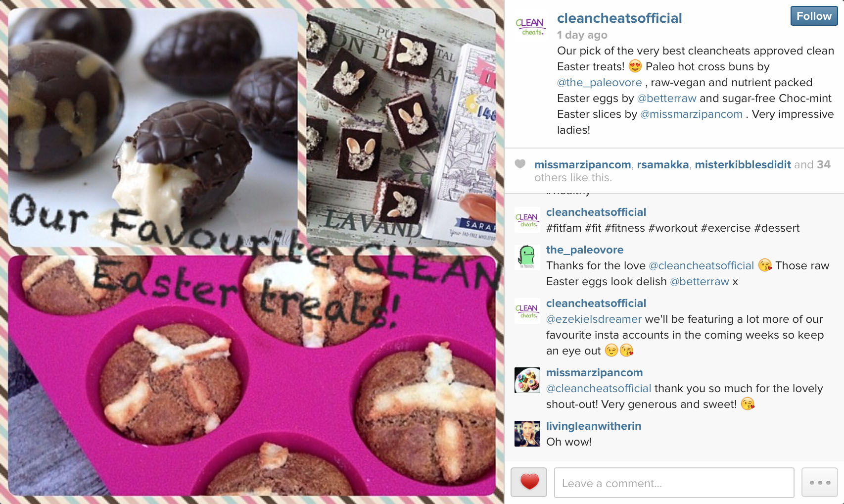 An unexpected spin-off from having posted a picture of my “Easter-fied” IQS Choc Mint Slices via Instagram was that Sarah Wilson herself seemingly liked my idea, reposting* my image on her Instagram profile… which, in turn, generated a very generous response from her followers (of which there are over 60, 000!). CleanCheatsOfficial later picked my idea along with two others as their “pick of the very best cleancheats approved clean Easter treats”.