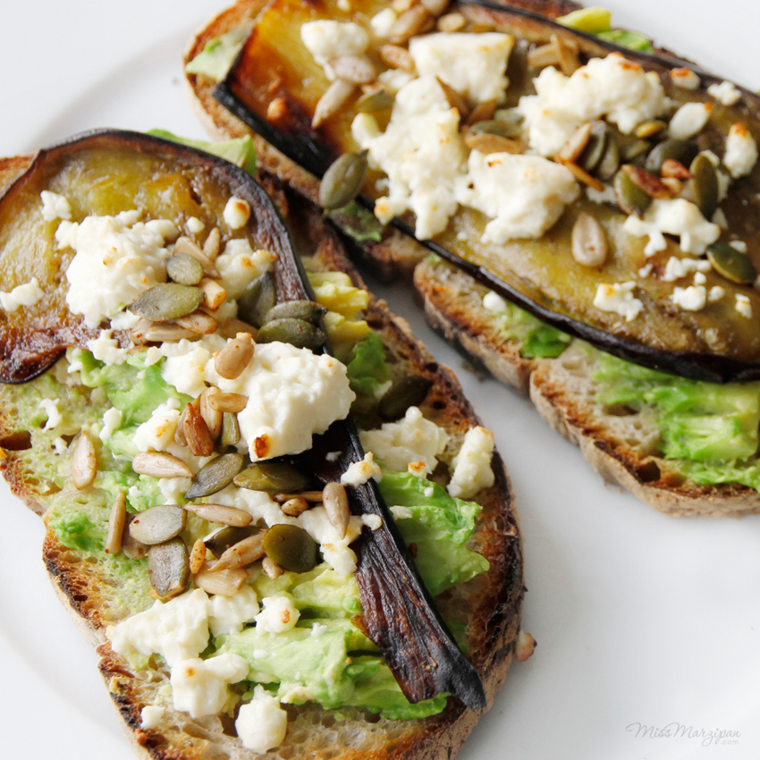 - Toastie of left over grilled eggplant, smashed avocado, crumbled feta and toasted tamari seeds