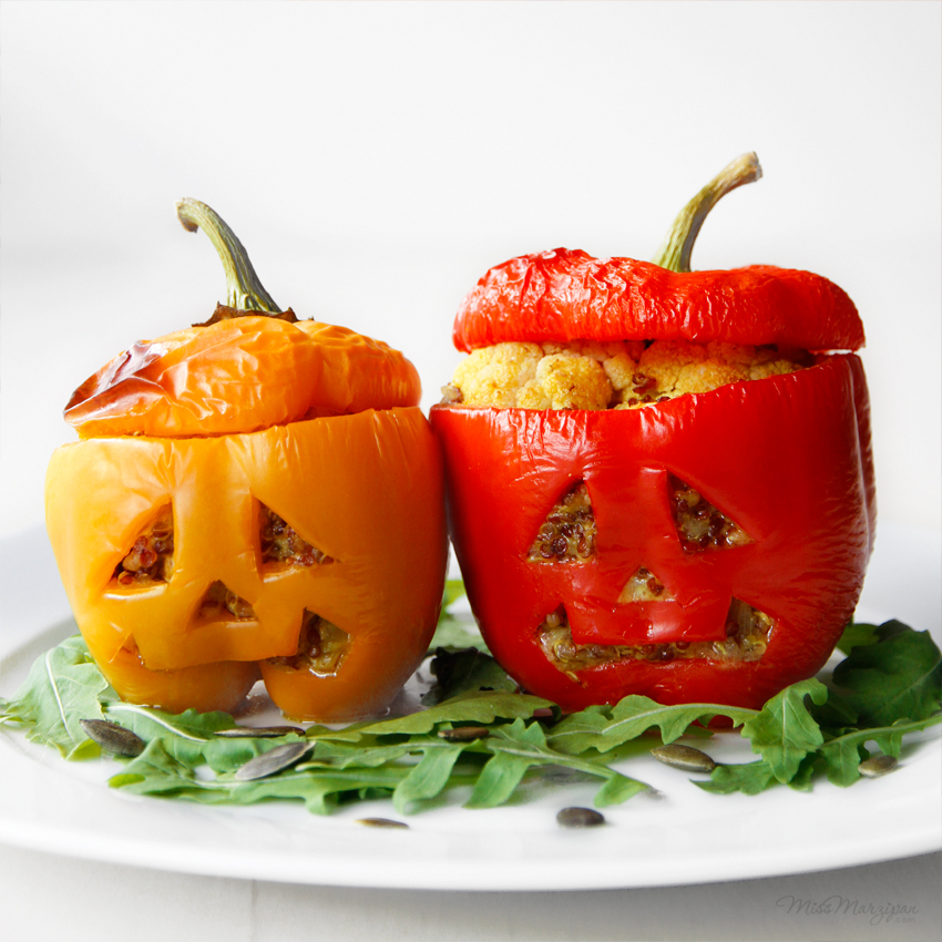 - Curried Quinoa and Zesty Roasted Cauliflower stuffed Bell Peppers (the bell peppers were a Halloween-y addition and not part of the IQS8WP recipe)