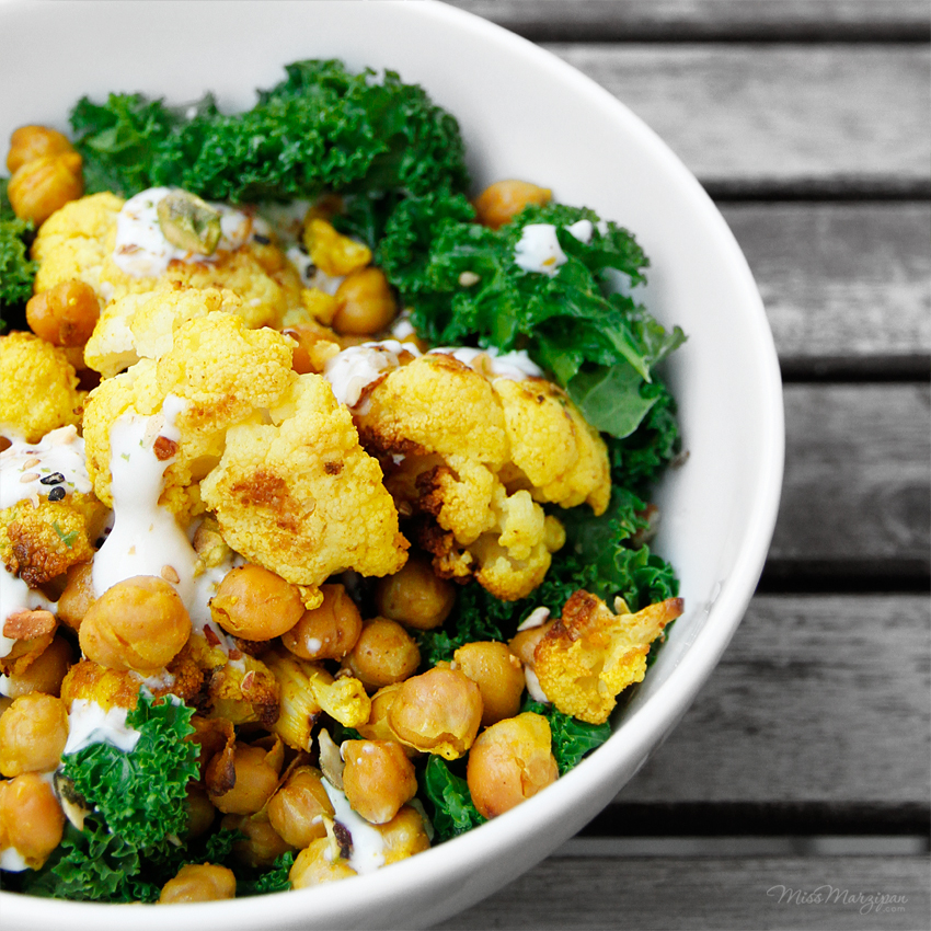 - Roasted Cauliflower + Chickpeas with Dukkah Kale